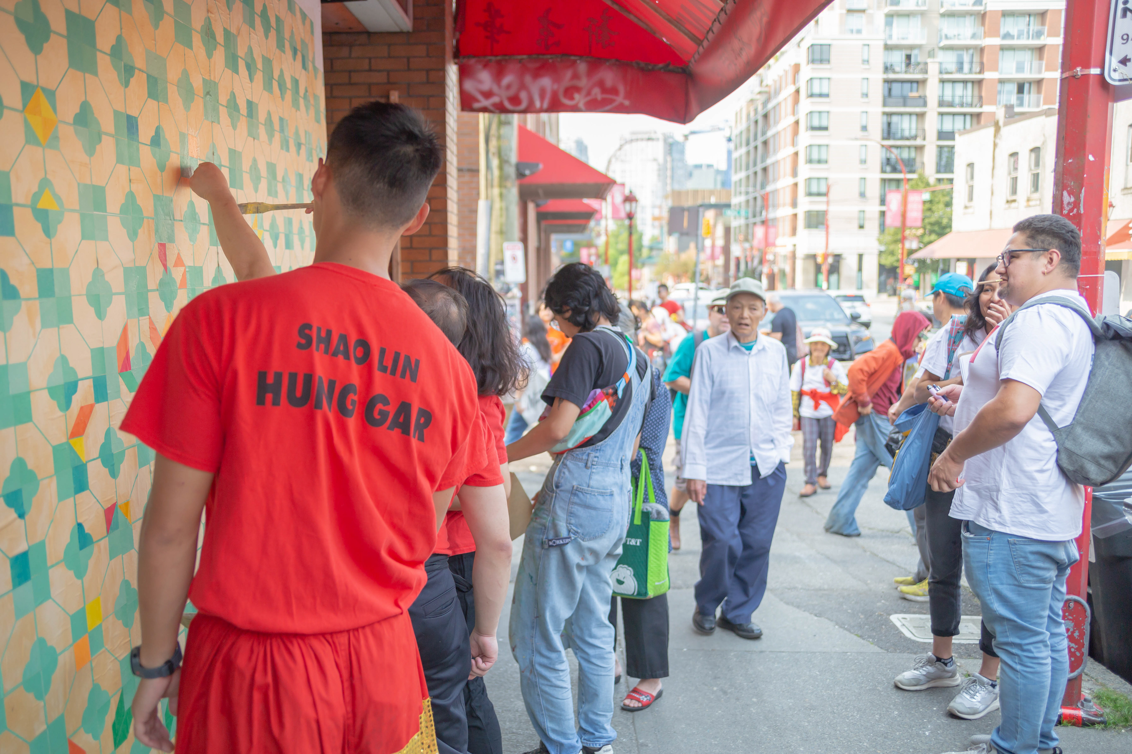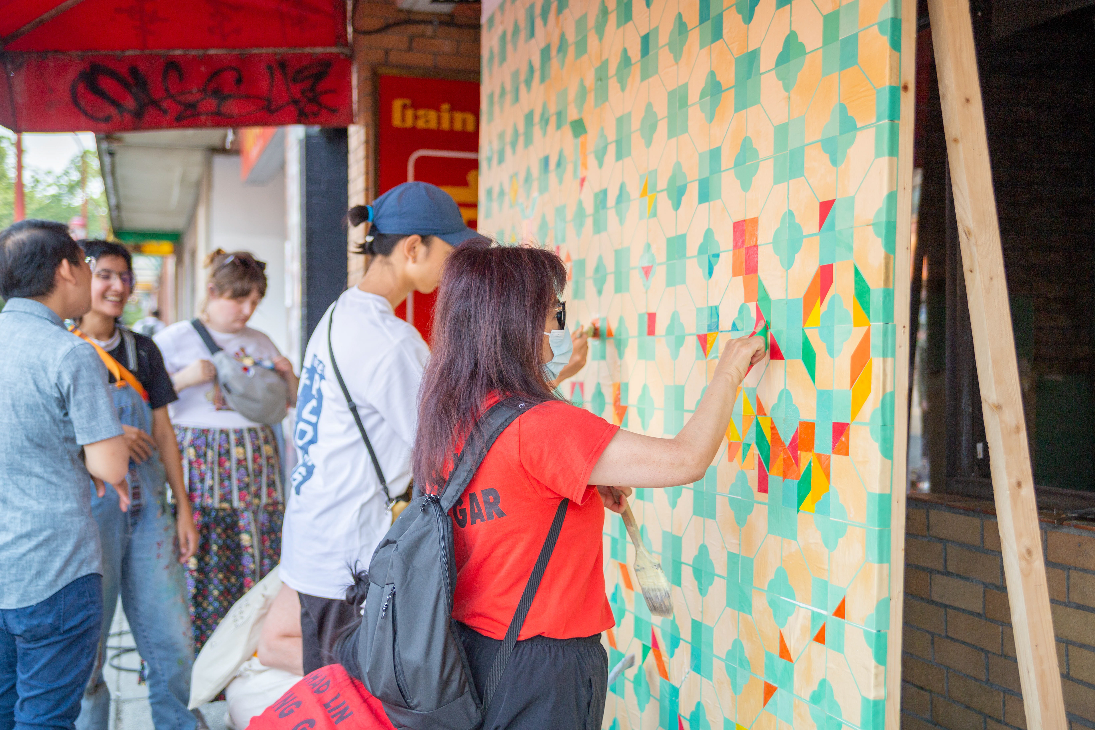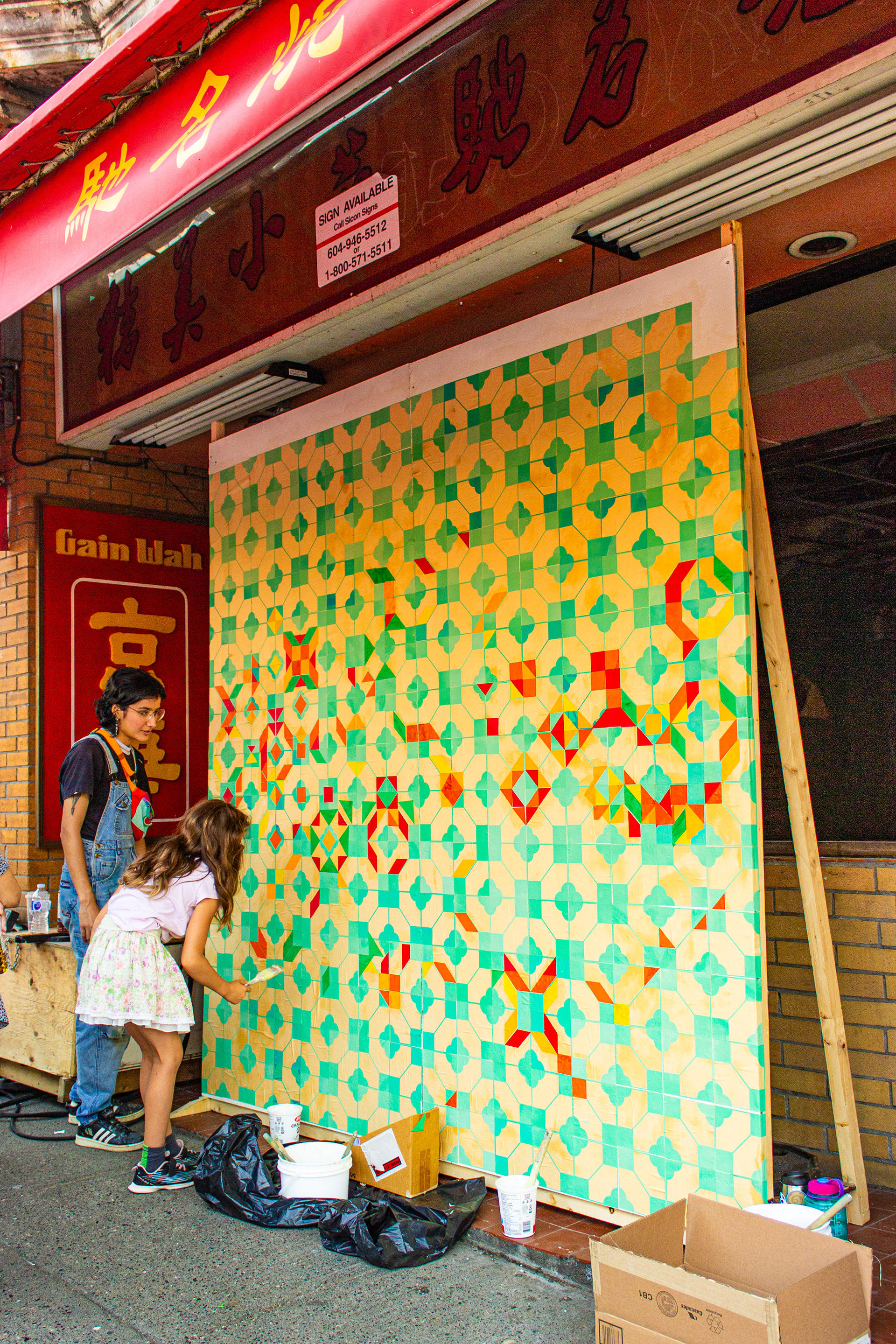 Pasting for Chinatown was a community art project designed for the SRO-Collaborative's Gain Wah Block Party in September 2024. The screenprinted repeating backdrop became a loose guideline for community members to paste geometric shapes into, tessellating and evolving overtime.